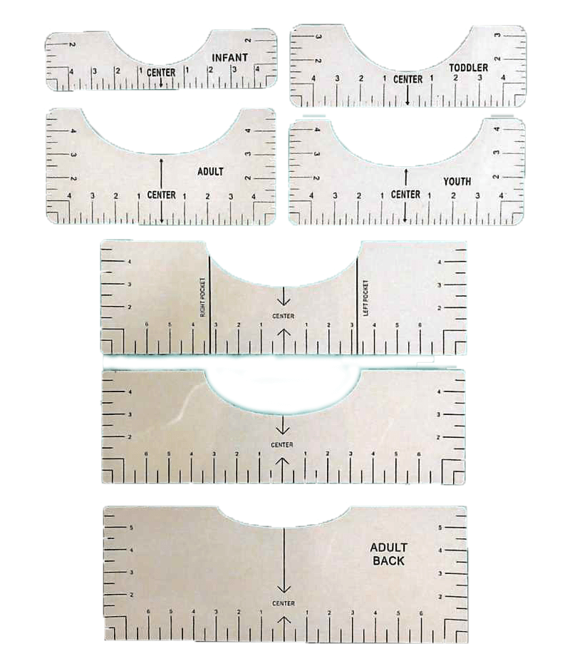 プレス加工時の転写位置合わせには熟練が必要ですが、「GRID IT」を使えば簡単に正確な配置が可能です。首元に設置することで中心や左右の位置を確認でき、7枚セットで背面用も含み、ほとんどのサイズに対応します